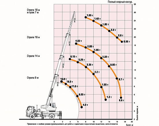 - Стрела - телескопическая трёхсекционная. Телескопирование стрелы - гидроцилиндром и системой полиспастов. С целью увеличения длины стрелы и подстрелового пространства возможна дополнительная комплектация гуськом длиной 7,0 м.