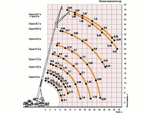 - Стрела - телескопическая четырёхсекционная. Телескопирование стрелы - гидроцилиндрами и системой полиспастов. Материал металлоконструкций стрелы - сталь S700MC. С целью увеличения длины стрелы и подстрелового пространства возможна дополнительная комплектация гуськом длиной 9,0 м., устанавливаемым при работе параллельно основной стреле или под углом 30 град.