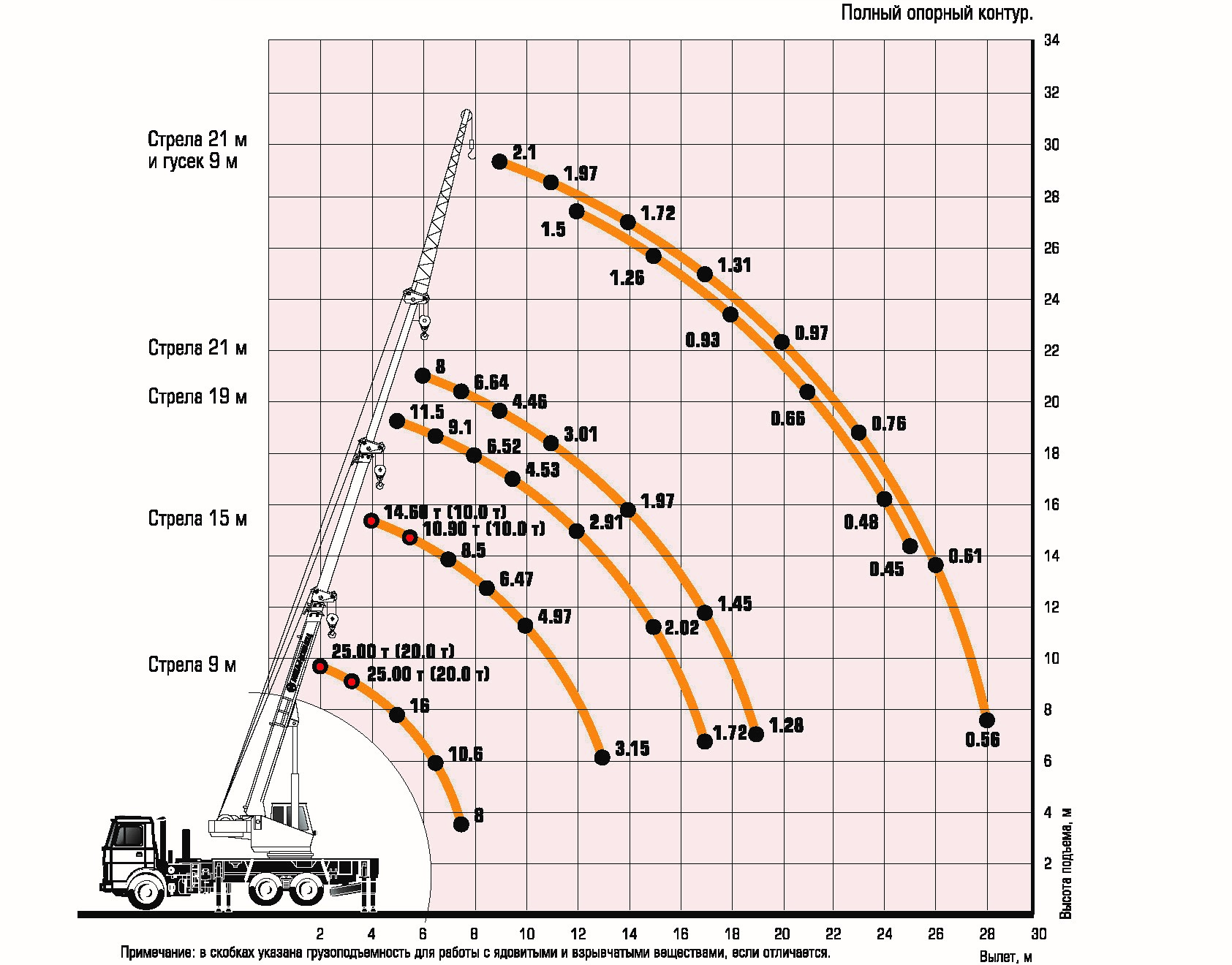 - Максимальная грузоподъёмность при работе с обычными грузами - 25 т