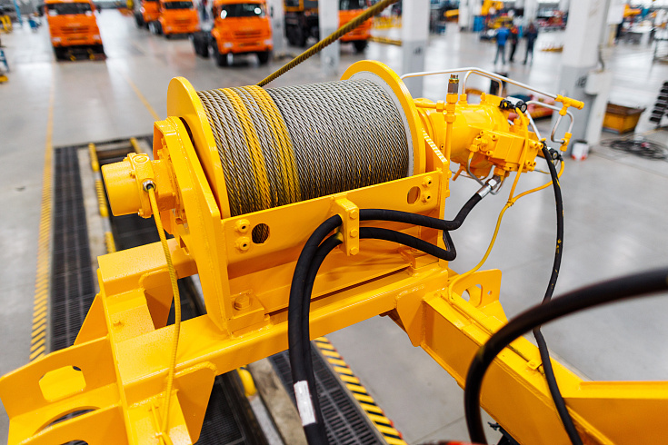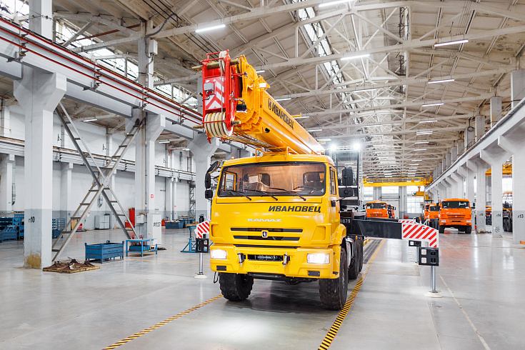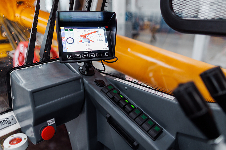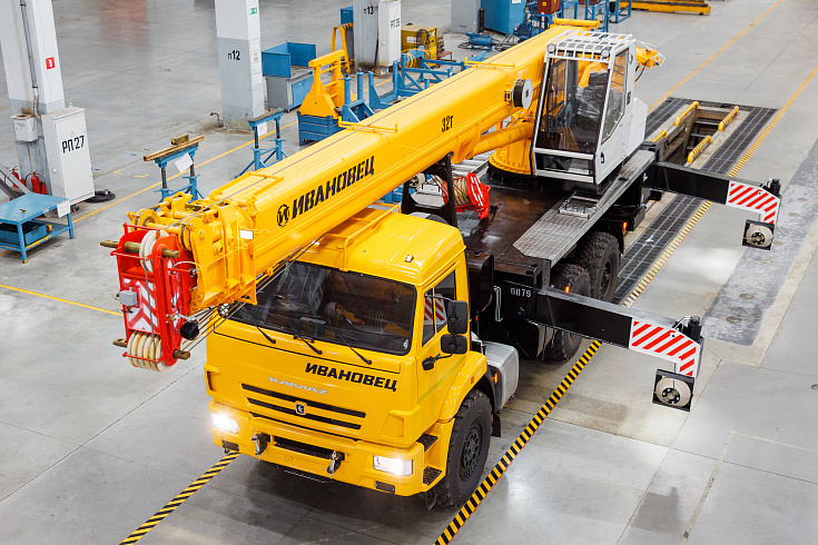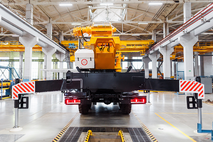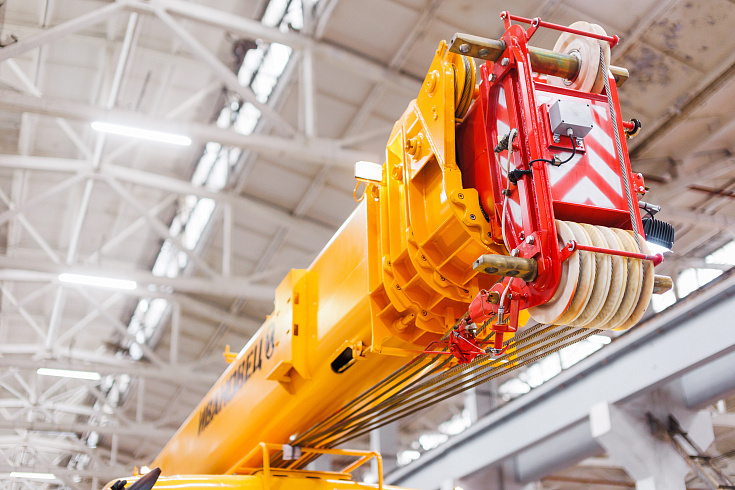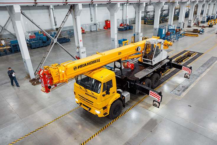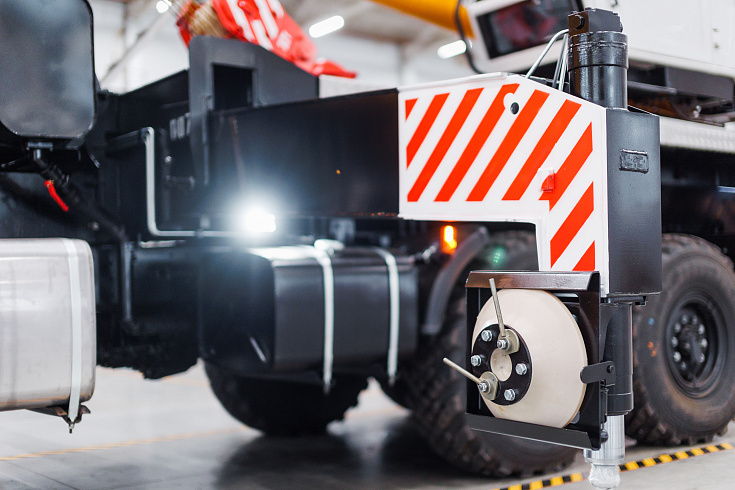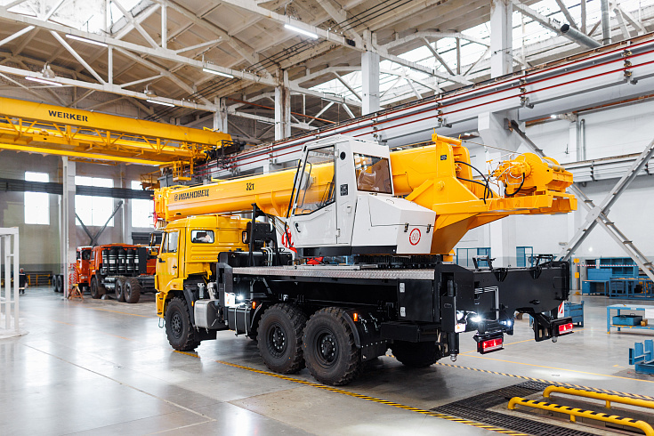 За счет широкого применения высокопрочных сталей, роликового ОПУ собственного производства, грузовой лебедки Zollern, нашей фирменной овоидной стрелы и других высокотехнологичных решений, нам удалось «вписать» массу 32-тонного автокрана в 21,5 тонну. Аналогов кран не имеет.